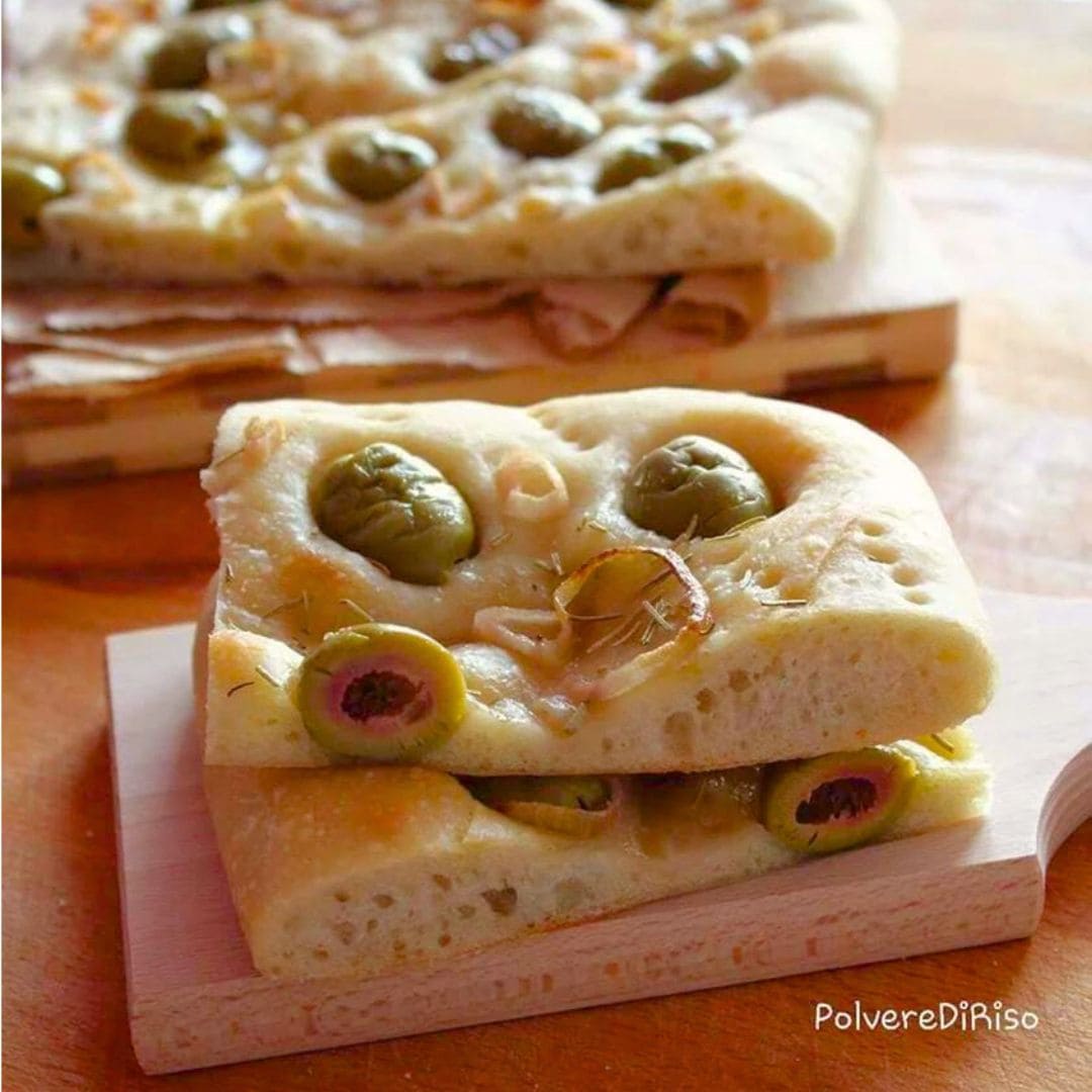 Un pezzo di focaccia soffice con lievito madre tra le mani e torno subito a tanti anni fa, quando ragazzina mangiavo la focaccia o pizza bianca con le olive verdi al suono della campanella.