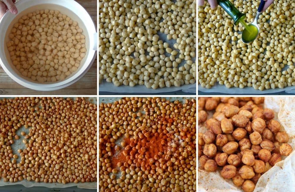 3. Trasferire ora i ceci in una teglia da forno, ricoperta di carta forno, versare i 3 cucchiai d’olio, amalgamare e cuocere in forno statico a 200° per 1 ora circa (il tempo varia in base al forno). Se necessario gli ultimi 10 minuti passare alla modalità ventilata.