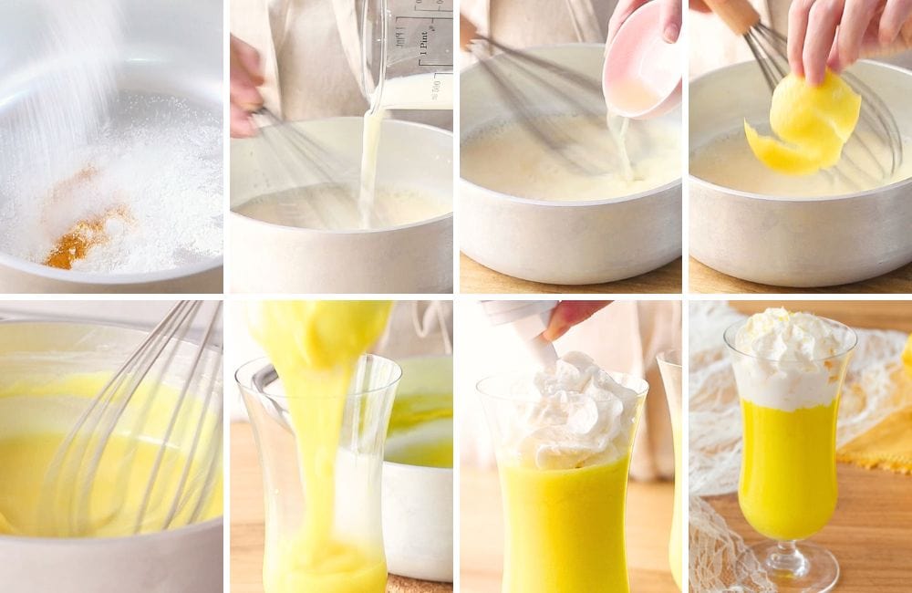 La preparazione della coppa al limone è davvero semplice: si tratta di realizzare una crema che ha il procedimento simile a quello della crema pasticcera, ma senza l’aggiunta di uova e dal risultato diverso. Una volta pronta, la verseremo in calici o bicchieri alti e la lasceremo raffreddare in frigorifero per qualche ora. Al momento di servire, decoreremo con panna montata e una spolverata di scorza di limone.