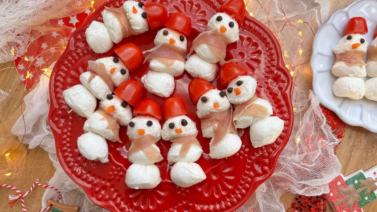 Questa ricetta è l’esempio perfetto di come anche un antipasto freddo possa diventare protagonista della tavola delle feste. I bocconcini di mozzarella diventano corpo e testa del pupazzo, mentre pepe in grani (oppure le olive nere) si trasformano in occhietti curiosi. Un semplice pezzetto di carota crea il classico nasino, i pomodorini diventano cappellini colorati e una strisciolina di prosciutto crudo si trasforma in una sciarpa elegante.